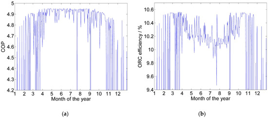Average heat pump COP (a) and ORC efficiency (b) for the whole year of 2016.