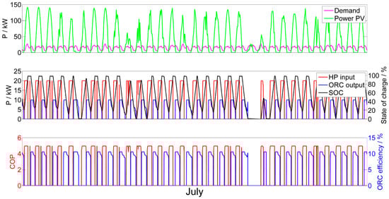 Course of the energy demand, energy input coming from the HP, state of charge (SOC) of the thermal energy storage, energy generated by the ORC, energy supplied by the PV as well as heat pump COP and ORC efficiency for July 2016.