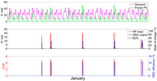 Course of the energy demand, energy input coming from the HP, state of charge (SOC) of the thermal energy storage, energy generated by the ORC, energy supplied by the PV as well as heat pump COP and ORC efficiency for January 2016.