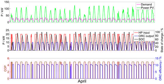 Course of the energy demand, energy input coming from the HP, state of charge (SOC) of the thermal energy storage, energy generated by the ORC, energy supplied by the PV as well as heat pump COP and ORC efficiency for April 2016.