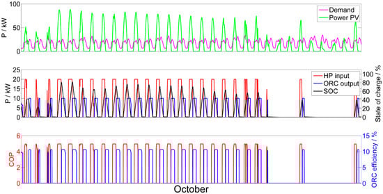 Course of the energy demand, energy input coming from the HP, state of charge (SOC) of the thermal energy storage, energy generated by the ORC, energy supplied by the PV as well as heat pump COP and ORC efficiency for October 2016.