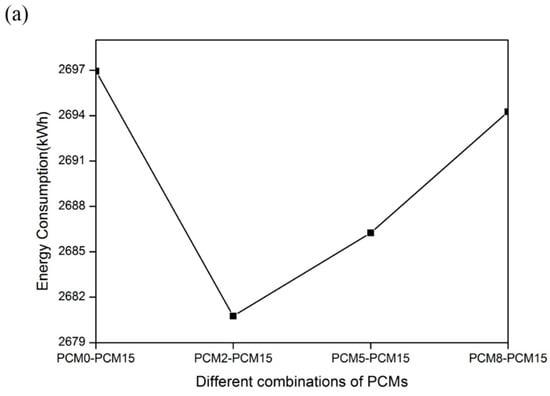 In this section, the influence of the phase change temperature on room energy consumption was investigated. When the PCM of the south wall was kept as the PCM15, the energy consumption of the room with different PCMs integrated on the roof and the other three walls are shown in Figure 3a. It can be observed that the room had the lowest energy consumption when the PCM2 was installed on the roof and the other three walls. At this time, compared with other PCMs, the PCM2 with suitable phase change temperature and latent heat can be utilized more effectively. Similarly, Figure 3b shows the energy consumption of the room with different PCMs integrated into the south wall when the PCM of the roof and the other three walls was the PCM2. The energy consumption of the room could be minimized by integrating the PCM8 in the south wall. Therefore, in the subsequent study, the PCM8 was integrated into the south wall, while the PCM2 was installed on the roof and the other three walls.