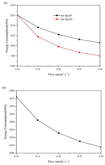 (4) As the ventilation rate of air layer 1 or air layer 2 increased, the room energy consumption decreased. Similarly, the higher the flow rate between air layer 2 and the room was, the lower the energy consumption of the room was. However, there is an optimum value for the flow rate between air layer 2, air layer 3, and the room to minimize the energy consumption of the room, which was 0.09 m3·s−1.