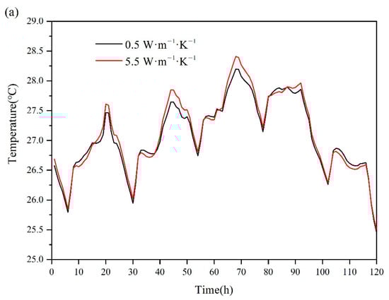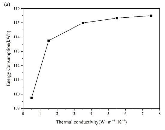 In this part, the effect of the thermal conductivity of PCMs on room energy consumption was investigated. During the ventilated month of the roof, the energy consumption of the room is shown in Figure 8a when the PCMs with different thermal conductivity were placed on the roof. Moreover, the internal surface temperature history of the roof from 6 July to 10 July is shown in Figure 9a. It can be seen that as the thermal conductivity decreased, the energy consumption of the room also decreased. When the thermal conductivity was less than 1.5 W·m−1·K−1, the reduction in energy consumption became larger. In July, nighttime ventilation facilitated the solidification of the PCMs to release heat, and a portion of the heat was transferred to the room. When ventilation was stopped, the cold energy stored in the building materials at night was gradually transferred to the room. Subsequently, as the solar radiation gradually increased, the heat absorbed by the building materials was also gradually transferred to the room. In these processes, thermal conductivity played an important role in heat transfer, and the greater the thermal conductivity was, the faster the energy transfer was. Therefore, the room energy consumption increased as the thermal conductivity of the PCMs increased. However, as shown in Figure 8b, during the ventilated month of the south wall, the more the thermal conductivity of the PCMs integrated into the south wall, the lower the energy consumption of the room was. The internal surface temperature history of the south wall from 21 January to 25 January is shown in Figure 9b. During the ventilation period of the south wall, when the hot air flowed to air layer 3 at a certain flow rate during the daytime, the PCMs with a larger thermal conductivity could absorb more heat and reduce the cooling energy consumption. Moreover, at night, the PCMs with a larger thermal conductivity could release more heat into the room and reduce the heating energy consumption. Therefore, the room energy consumption decreased as the thermal conductivity of the PCMs increased.