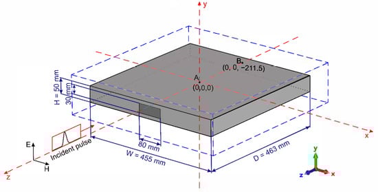 The enclosure was placed symmetrically in a computational cell with the dimensions × (−235 mm, +235 mm), y (−32.5 mm, +32.5 mm), z (−239 mm, +239 mm) (see Figure 1). The computation area (470 × 65 × 478 mm) is marked with blue dashed lines in Figure 1. The front plane of the computation area is set to z = +239 mm. The subnanosecond high-power EM interference plane wave pulse (called the incident pulse in the following sections on the simulations and their results) propagates perpendicularly towards the enclosure front wall (i.e., in the –z direction). It is assumed that the electric field strength vector E of the incident pulse is directed in the +y direction (correspondingly, the magnetic field strength vector H is directed in the +x direction).