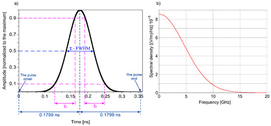 The parameters of the incident pulse (Figure 2) were as follows: the maximum electric field strength amplitude—106 V/m, the maximum magnetic field strength amplitude—2.68·103 A/m, the maximum pulse power density—2.68 GW/m2, time when the amplitude of the electric or magnetic field strength reaches maximum value—tmax = 0.1779 ns, the full width at half maximum (FWHM) of the incident pulse—τ = 0.0804 ns, the pulse rise time—τr = 0.058 ns, the pulse fall time—τf = 0.058 ns.