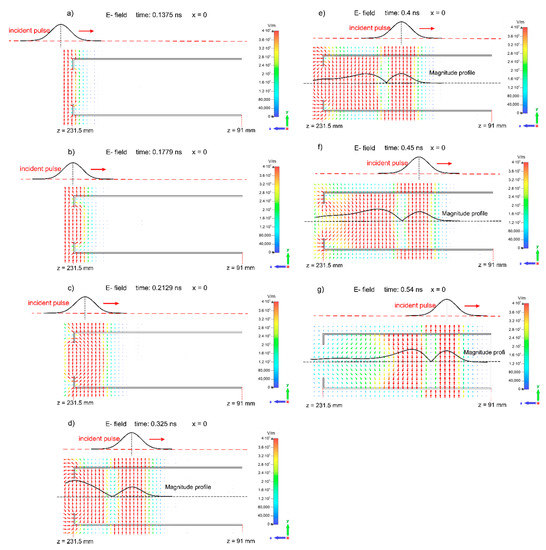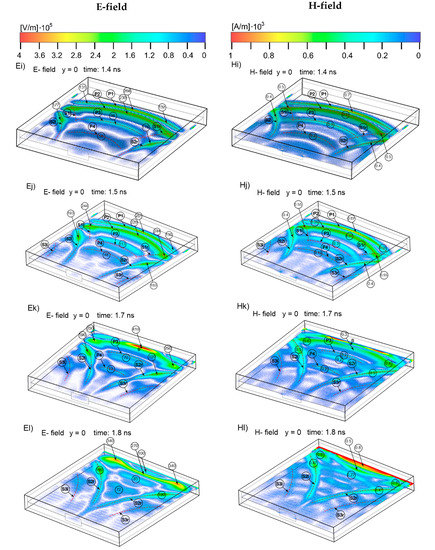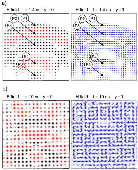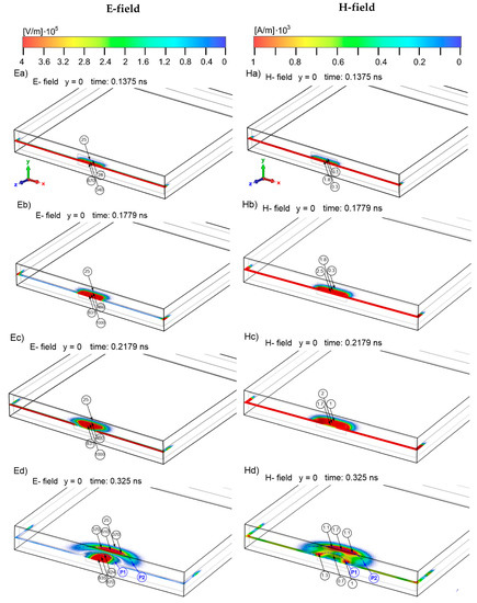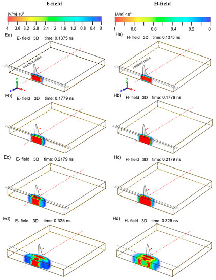 In both development phases, the polarization planes of the electric and magnetic fields in the enclosure are compatible with the polarization planes of the electric and the magnetic fields of the incident wave pulse, respectively, i.e., the electric field is vertical and the magnetic field is horizontal with respect to the base (the largest wall) of the enclosure (Figure 9, Figure 10 and Figure 11). The simulation results presented in Figure 9, Figure 10 and Figure 11 show that, according to Maxwell’s laws, the vectors of magnetic field H are perpendicular to the vectors of the electric field E and the magnetic field lines form closed loops (shown in Figure 11b, right).