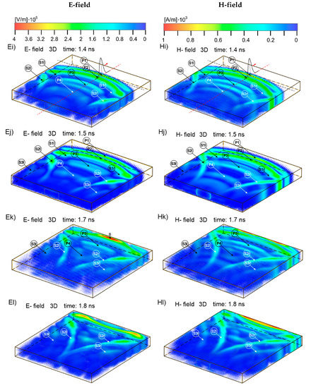 Figure 3Ek and Figure 4Ek (at t = 1.7 ns), Figure 3El and Figure 4El (at t = 1.8 ns), and Figure 3Em and Figure 4Em (at t = 1.9 ns) showed interference images of the electric field in the enclosure when the primary waves P1 and P2 travelled towards the front wall after their reflection from the rear wall and the secondary waves still moved towards the rear wall, i.e., in the opposite direction to the primary waves P1 and P2. Although the primary waves P1 and P2 experienced locally constructive and destructive interferences with the secondary waves in the period t = 1.7–1.9 ns, the fronts of the waves P1 and P2 can be identified against the background of various types of local interference patterns.