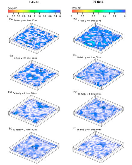 In the first phase (the wave phase) of the development of the EM field in the enclosure, the associated electric E and magnetic H fields formed primary and secondary EM waves (visible in Figure 3Ea–Eq,Ha–Hq and Figure 4Ea–Eq,Ha–Hq). In the next development phase (the interference field), the EM field in the enclosure should rather be considered in terms of temporally and spatially varying patterns of the associated electric E and magnetic H fields (Figure 3Er–Ex,Hr–Hx and Figure 4Er–Ex,Hr–Hx).