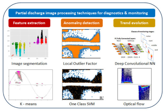 Partial discharge image processing and machine learning techniques for diagnostics and monitoring analyzed in the paper in the following classes: feature extraction, anomaly detection, and trend evolution.