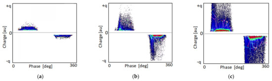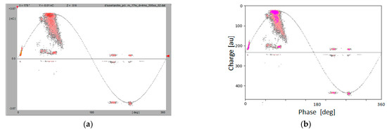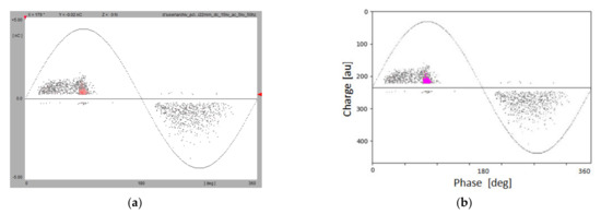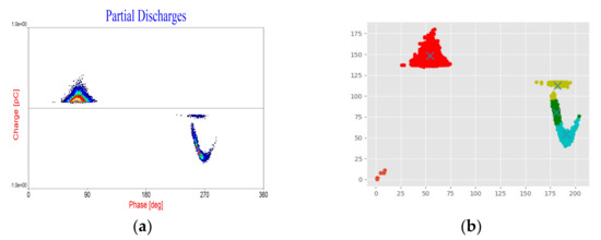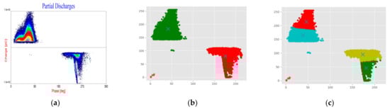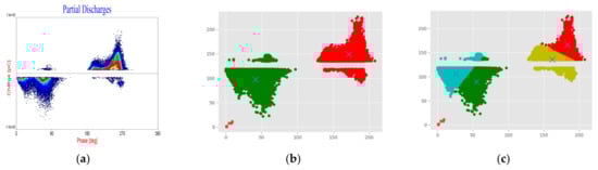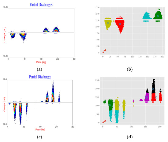 The color palette in the PD image reflects the intensity of the discharges in certain phase slots of a high-voltage period. The PD image shown in Figure 4a reflects the stage where two distinguishable groups per phase can be identified. In a first approximation for K = 2, two PD groups from the positive and negative voltage periods are automatically clustered properly (Figure 4b) along with the impulse overshoots in each phase, forming the opposite tiny clusters. In the case of K = 4, each of the previously extracted clusters is subdivided according to its intensity (Figure 4c).