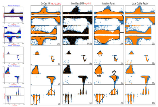 The comparison shown in Figure 10 demonstrated the isolation of individual pulses or low-density PD populations as outliers. The Isolation Forest approach has rather clustered whole regions or segments in the PD image, whereas OneClassSVM creates boundaries more selectively around the individual pulses for kernel parameter σ2 = 0.1 and less selectively for σ1 = 0.001. Local Outlier Factor classifies the individual pulses and low-density envelopes of the characteristic PD groups as outliers. The presented approach might be very useful in identifying non-coherent noise and disturbances as anomalies in a PD pattern in future autonomous PD expert systems.