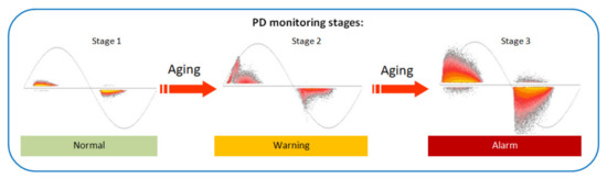 Example of PD monitoring sequence and distinctive patterns reflecting stages. of electrical insulation condition.