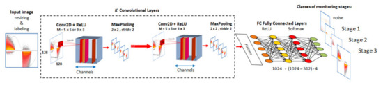 The convolutional neural network topology applied to PD patterns in monitoring application is shown in Figure 12. In the presented example, the CNN may contain up to 6 convolutional Conv2D and MaxPooling layers, which are followed by up to 5 fully connected (FC) hidden layers, each having from 128 to 1024 sigmoidal nodes. The dimension of an output layer contains a number of outputs that is equal to the number of subclasses of PD pattern. The PD images had a format 128 × 128 × 3 and applied kernel filter had a size 5 × 5 pixels. The size of convolution kernels M was selected in a range from 32 to 128 [36].