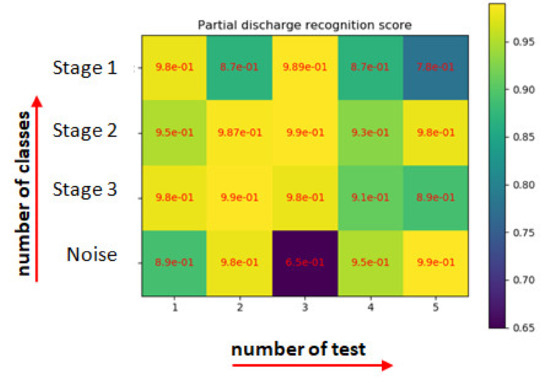 Recognition score array in PD monitoring example after 50 epochs using convolutional. neural network. According to the notation rows relate to the number of classes and columns to the number of test sets.
