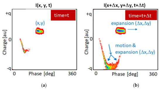 Visualization of PD pattern evolution in a form of motion and expansion along phase and charge axes: (a) image at time t; (b) image at time t + Δt.