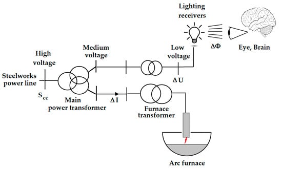 Voltage fluctuations propagate to the supply network and other lines inside the steelworks, including circuits containing lighting receivers—Figure 2. Changes in the voltage supplying lighting receivers cause changes in the luminous flux (ΔΦ), which at a certain amplitude and frequency of changes are noticeable by the human eye, causing the negative effects described above. UIE has established a Committee for the Study of Disturbances (S.C.), composed of experts from various countries. This committee undertook research aimed at assessment of various types of voltage fluctuations, including irregular and time-varying ones, and development of a universal measurement method and regulations for connecting non-static loads to the network. In the first years, several series of comparative measurements were carried out, using measuring devices developed in different countries, to assess their advantages and disadvantages. The effect of long-term experimental and theoretical research was the development of a device for measuring flicker of light, called UIE-flickermeter [29,30].