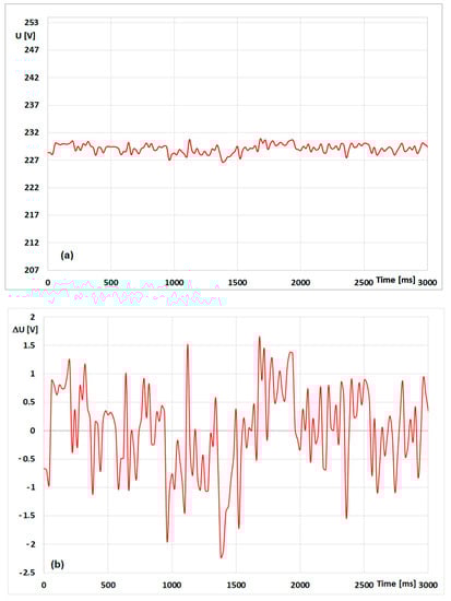 RMS value changes (a) and voltage fluctuations (b) recorded in the power supply line lighting receivers.