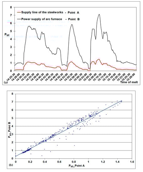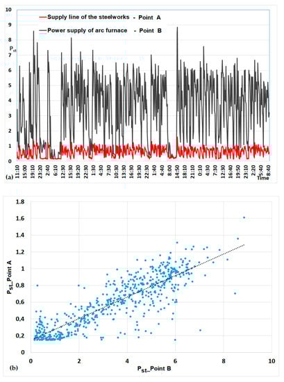 Changes of Pst short-term flicker severity recorded simultaneously during one smelting of measurements at two points: steelworks supply line—point A, EAF supply line—point B (a), correlation between the flicker Pst Point A and Point B (b).