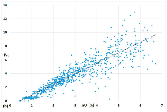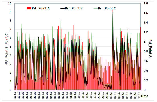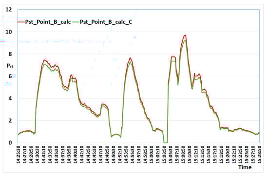 In Figure 7, the waveforms of light flicker indicators measured in the supply network of the steel plant Pst_Point B and the supply network of the steelworks Pst_Point A-cal were presented, as well as the theoretically determined by the Formula (5)—Pst_Point A-cal. Only the Pst_Point-meas and Pst_110 kV-cal indicators are compared.