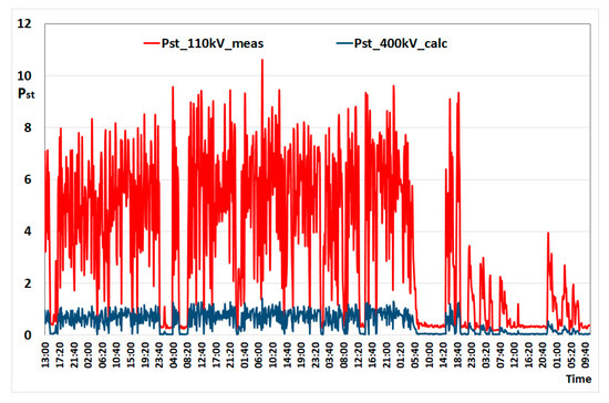 Changes of Pst short-term flicker severity recorded during one week of measurement (Pst_110 kV_meas) and determined by the Formula (5) (Pst_400 kV_cal).