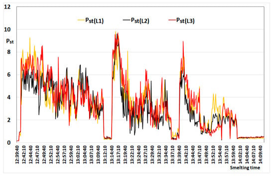 The statistical analysis of changes in short-term flicker severity Pst in short time intervals covering individual heats in the arc furnace is presented below. The statistical analysis of the short-term flicker severity Pst was based on the data recorded during individual melts (10 s measurement intervals). Figure 11 shows the change of the Pst coefficient measured in the three phases of the steelworks supply network during one melt carried out in the arc furnace. Very high values of the flicker coefficient are visible in particular phases, namely, Pstmax(L1) = 9.81; Pstmax(L2) = 9.60; Pstmax(L3) = 9.69. The high-level flicker of lightresults from the relatively low short-circuit power SSC = 750 MVA in relation to the power at the short circuit of the electrodes with the approximate charge SSCf = 40 MVA.