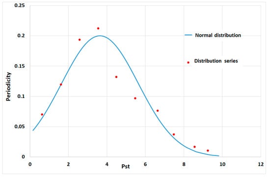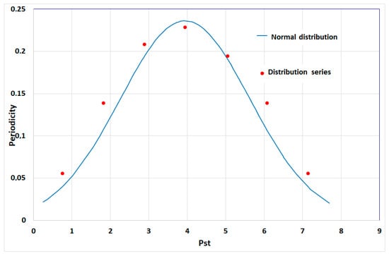 The distribution series was divided into m = 7 classes with the class length calculated as (Pstmax − Pstmin)/m = (7.69 – 0.25)/7 = 1.06.