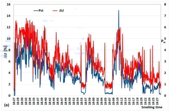 Figure 4 shows changes in short-term flicker Pst measured during one week at point A (110 kV line supplying the steelworks) and point B (30 kV line supplying EAF)—Figure 3.