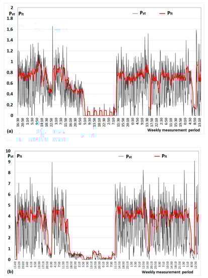 Figure 18 shows the changes of long-term severity flicker Plt and short-term severity flicker Pst recorded in the supply line to the ironworks (a)—Point A (Figure 3) and steel plant (b)—Point B (Figure 3), during the weekly measurement cycle.