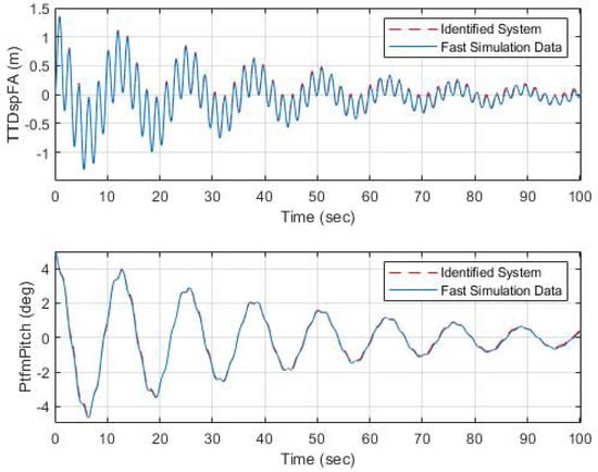 The responses of both models, the FAST and the proposed one, are similar throughout the simulation. However, although the model proposed in [] initially has the same behavior, it accumulates a drift error that deviates its response from the real system generated with FAST-SC. Figure 5 shows that both the displacement of the tower top (upper graph) and the pitch of the platform (lower graph) are much better represented by the model identified here proposed than by that of [].