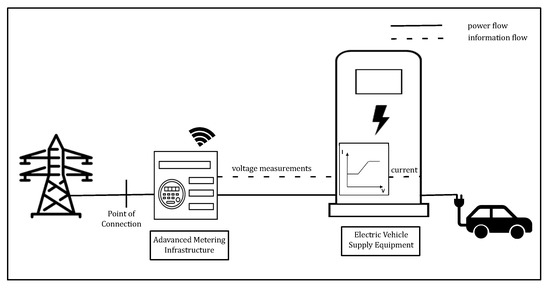 Reducing voltage deviations stemming from EV charging, and, thereby improving the voltage profile of distribution grids, is the main objective of the voltage-based control approach considered. To facilitate the control mechanism, it is assumed that each EV charging infrastructure is equipped with a droop controller accompanied by an advanced metering infrastructure (AMI) at the point of connection [19] capable of measuring the voltages. The general concept of the voltage droop mechanism is depicted in Figure 1.