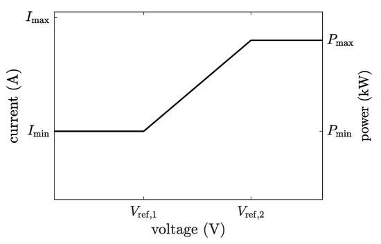 As defined in Equation (1), if the node voltage V, measured at the point of connection, falls below the lower reference value , the charging current I is limited to the minimum charging current . According to the IEC-61851 EV charging standards, this is to be 30% of the rated charging current. If the node voltage exceeds the upper reference value , the charging is not limited by the controller and allowed to be carried out at the maximum current . This limit for charging current is determined based on the nominal charging power levels. If the voltage lies between the lower and upper voltage reference values, the charging current is controlled in accordance to the linear droop characteristics.