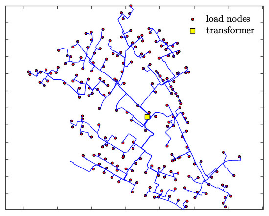 The topological data and grid parameters of a real Austrian distribution grid were provided by the local distribution system operator (DSO), Vorarlberger Energienetze GmbH [20]. The simulated LV grid comprises two 630 kVA, 10/0.42 kV step down 3-phase transformers with 221 load nodes. The grid supplies 600 residential consumers, 52 business units, and 99 other consumer units which include heat pumps, public facilities, etc. Figure 3 shows the geographical representation of the simulated LV network.