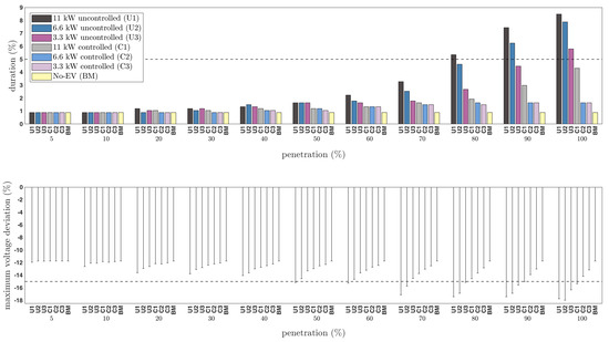 As illustrated in the bottom plot of the Figure 4, the voltage deviation exceeds the %-limit already in the benchmark scenario (without EVs). Nevertheless, the grid voltage is in compliance with the EN50160 voltage standards as the maximum duration below the %-limit is less than 5% of the time. The compliance with time limit is met in all the scenarios up to 70% penetration as illustrated from the top plot of Figure 4, however, utilization of the available voltage reserves grows steadily with increasing penetration for the uncontrolled scenarios (U*), most notably in the scenario U1 (uncontrolled 11kW-scenario). In contrast, the minimum voltage deviation exceeds the %-limit already at lower penetrations, resulting in a violation of the voltage limit defined in the ENE50160 standards. Specifically, at 50% penetration in case of 11kW (U1) followed by kW (U2) at 70% penetration, and 80% for the kW (U3) charging rate.
