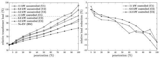 As a consequence of the changes in the charging demand due to the intervention of the controller, the power profile at the transformer changes, which, in turn, affects the peak power. To show this effect, the peak power and the relative reduction in the peak power at the transformer resulting from the droop controlled charging are depicted in Figure 5. Peak power increases with progressive EV penetration in all six scenarios. At high penetrations, the peak power exceeds the transformer rated capacity in the uncontrolled scenarios (U*). In the voltage droop controlled scenarios, a consistent reduction in relative peak power at the transformer could be noticed: from %, over %, up to % for the different penetration rates of 5%, 50%, and 100%, respectively. This shows that in addition to the voltage regulation services provided to the DSOs, the method provides a reduction in peak power at the transformer, preventing potential transformer upgrades.