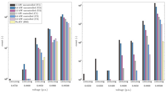 We conducted a quantitative analysis of the number of under voltage events in order to gain a more in-depth understanding of the voltage droop control. The histograms in Figure 6 compare the number of under voltage events for the six scenarios at 10% and 90% penetration. The histograms show that the number of under voltage events has been reduced in the three droop controlled scenarios (C1–C3) for both penetrations. In addition, the evaluation confirms the elimination of severe under voltage events due to the droop control, which occur in uncontrolled charging at high penetrations. Furthermore, it clearly shows the direct dependency of the relative reduction in under voltage events on the EV penetration rate.