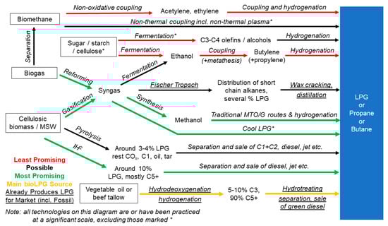 Biogas production by anaerobic digestion (AD) and landfill capture is also widely practiced across the globe with relatively mature technology. The methane in biogas can be separated out and reformed to higher chain length alkanes, via thermal or nonthermal routes, but selective activation of the methane C-H bond is extremely challenging. Thermal methane coupling is mostly being developed to add value to waste gases, whereas nonthermal methane coupling (such as DBD plasma technology) is expected to have competitive economics on smaller scales if and when it reaches higher stages of development. Biogas can also be reformed to produce syngas, either after methane purification or using newer dry or bi reforming technology, and LPG can be made from syngas via a variety of routes. Fischer Tropsch technology produces a small quantity of LPG by-product, although the propane component is typically recycled with the goal of producing heavier liquid fuels. Selectively producing propane and butane and economically scaling down are two challenges facing bioLPG production by a Fischer Tropsch approach. Methanol-based routes to liquid fuels and products in the C3/C4 range are also industrially performed, although they do not generally aim to produce LPG and in many cases this approach is performed at very large scales [37]. Cool LPG is a process under development at the Gas Technology Institute (GTI) based on a methanol intermediate with the direct aim of LPG production using a scalable integrated process [37] (see Figure 3).