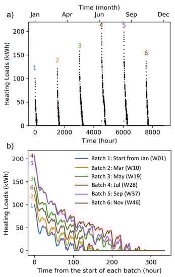Hourly heating demand of the chicken shed: (a) yearly loading pattern showing the six batches; (b) details of these six heating cycles over one year.