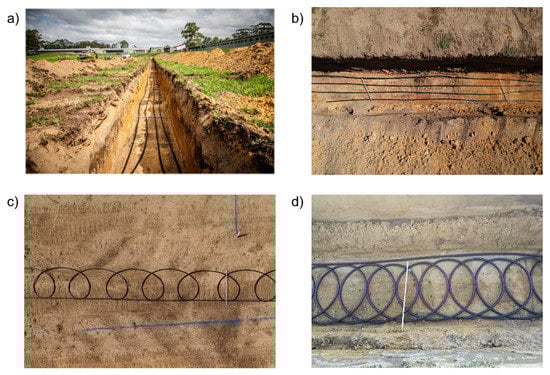 A ground-source heat pump (GSHP) system is a type of heat pump system that utilises the ground as a heat source or sink for heating and cooling purposes. Such systems have been increasingly utilised in the United States, Europe, Canada, China [], Korea, and Australia [] over recent years [,,,]. To exchange heat with the ground, ground heat exchangers (GHEs) are typically used; they comprise high-density polyethylene (HDPE) pipes, and a carrier fluid (typically, a solution of water and antifreeze) circulates inside the HDPE pipes [,]. GHEs can be integrated into various spaces and structures, including vertical boreholes, horizontal trenches, energy piles, energy-retaining walls, and energy tunnels []. Among these, vertical boreholes and horizontal trenches are the two most commonly utilised for GHEs. While vertical boreholes can be installed under almost any ground and site conditions, horizontal trenches are typically utilised in suburban and rural areas at a depth between one and two metres below the surface. Horizontal GHEs normally require a large field of land for their installation, but their installation is typically more economical than installation in vertical boreholes. As the heat exchangers are close to the ground’s surface, their thermal performance can be impacted by daily and seasonal variations in the air temperature [] and soil moisture content, with the latter affecting the thermal conductivity of the ground [,]. A well-designed GSHP system with horizontal GHEs can typically operate with a coefficient of performance (COP) of between three and five [,,,,,,]. The COP is defined as the ratio of heating (or cooling) supplied to the energy required to operate the GSHP. This means that, for three to five kWh of energy removed from/injected into the ground, only one kWh energy of electricity is consumed by the GSHP.