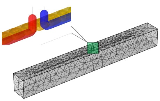 To conduct this research, a state-of-the-art transient 3D finite element model was developed using COMSOL Multiphysics, a widely used finite element simulation software []. Within the finite element package, the governing equations for the heat transfer and fluid flow were numerically coupled in order to evaluate the thermal performance of GHEs. The heat transfer around and in the GHEs was primarily modelled through the conduction and convection, where conduction happens in the ground (soil in this study), pipe wall, and partially in the carrier fluid, and convection takes places in the carrier fluid that circulates in the pipes. As horizontal loops are usually shallow, the groundwater flow is assumed to be zero, although this condition can be included with an additional coupled Darcy model. Specifically, the heat transfer in the fluid and fluid flow are simulated using 1D elements and are coupled to the 3D heat transfer in the surrounding soil and the GHEs. To model the 1D fluid flow inside the pipes, the continuity and momentum equations for an incompressible fluid are used as follows []: