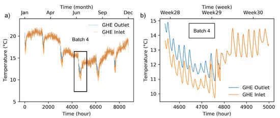 Outlet and inlet temperatures of the FEM-simulated GHEs: (a) results for one TMY; (b) results for batch 4.(system turned off at about 4800 h, ~12 days of heating in this batch).