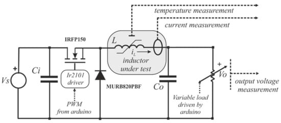 Based on these considerations, this paper analyzes the results obtained with a switching converter, driven by an automated measurement system that performs the test of power inductors in real operating conditions. The feasibility of such a system was previously examined in [28], where the circuit of the SMPS was controlled by a LabVIEW virtual instrument in order to vary the load. In this paper, a new complete version of the circuit is presented including the following improvements: (a) the temperature is taken into account, which allows characterizing the inductor at constant temperature; (b) the parasitic resistance of the winding is preliminarily estimated, and the related drop voltage is considered; (c) the measurements are repeated to assess the mean value and the standard deviation of the results, giving an estimation of the error; (d) a new inductor current sensor is adopted to avoid any influence in the measurement; € the PCB layout is optimized to minimize parasitic inductances and consequent voltage ringing during commutation. The proposed system returns the core saturation curve vs. inductance to be retrieved, as well as the magnetization curve profile, showing the inductance variation with the measured temperature. As an example of application, the characterization of two commercial inductors is proposed here, including them inside the SMPS circuit, retrieving the inductance vs. current curves at different temperatures. Different from [18], the proposed approach can be generalized for power inductors; it is cheaper compared to [22], which uses a temperature chamber, and a commercial system such as [25] and can be built for laboratory purposes. The inductor thermal behavior and modeling are relevant to the DC/DC converter and EMI filter design [23,24,29,30,31]. Our contribution addresses this issue since the characterization always takes into account the temperature measured on the core. Finally, the knowledge on the inductor can be exploited in converters with different layouts since the measured temperature will represent the real operating conditions.