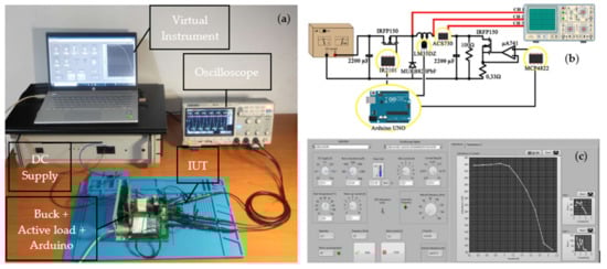 (a) Measurement setup. (b) Simplified circuit schematic with the black components assembled on a PCB. (c) Virtual instrument interface.
