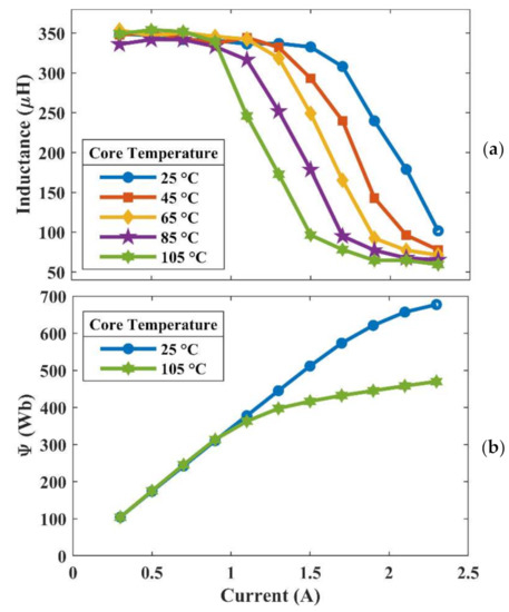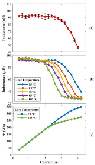 These measurements were repeated at temperature steps of 20 °C up to 105 °C. The corresponding curves are reported in Figure 4b. It can be noted that the saturation current decreases as the temperature increases, meaning that the higher the temperature, the greater the variations in the current with the same voltage applied. Moreover, the slope of the inductance plot in the saturation region slightly increases with the temperature. Based on the inductance curve, the magnetic flux vs. current can be retrieved by