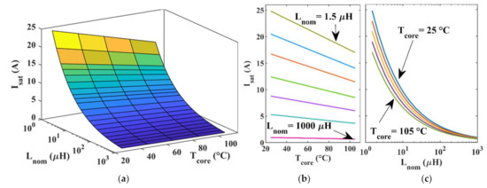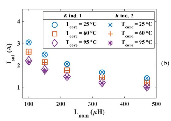 Figure 6b shows the comparison between the data obtained from (13) and the expression of K(Tcore) extrapolated from the measurement of inductors 1 and 2. Both expressions of K result in similar values of the saturation current for the whole Lnom range; nonetheless, a smaller range of inductance is shown in Figure 6b for the sake of tidiness. The quantitative data shown in Figure 6b are listed in Table 1.