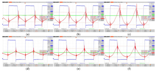 Experimental measurement of the diode voltage (blue), output voltage (green) and inductor current in AC coupling (red) for different inductors and temperature conditions. First row depicts measurement conducted on inductor 1 (Lnom = 100 µH) for Fs = 38 kHz, with a mean inductor current of 3.2 A at: (a) 25 °C, (b) 55 °C, (c) 95 °C. Second row depicts measurement conducted on inductor 2 (Lnom = 330 µH) for Fs = 18 kHz, with a mean inductor current of 1.7 A at: (d) 25 °C, (e) 55 °C, (f) 95 °C.