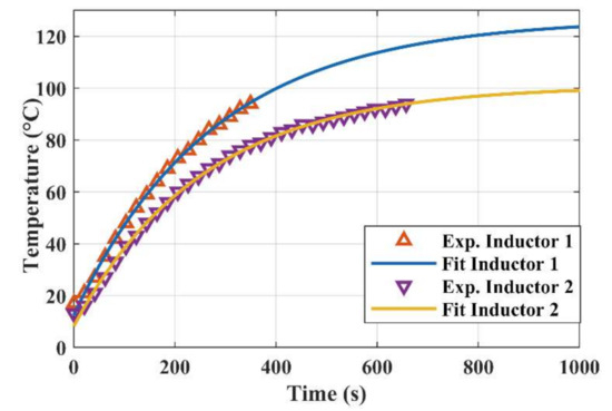Figure 9 shows the curves of the temperature vs. time. We stopped the tests when the temperature reached 95 °C to avoid damaging inductor windings; indeed, the insulation is made of polymers such as polyurethane, polyamide and polyester. These materials usually degrade when the temperature exceeds 80–150 °C [36], with consequent failure of the insulating film covering the copper and short circuits among wires. Furthermore, the manufacturer guarantees a constant IRMS current up to 85 °C [34]. Experimental data were fitted to retrieve the exponential curve describing the temperature transient. It can be noted that inductor 1 reaches the maximum temperature before inductor 2, as expected, since a greater current flows through it. The curve corresponding to inductor 2 tends to stabilize around the maximum temperature, whereas the curve of inductor 1 rises to about 120 °C. It should be underlined that these transients describe the rise in the temperature starting from the environmental temperature and a linear operation; the losses drive the inductor in the non-linear zone, further raising the maximum peak of the current and lowering the output voltage.