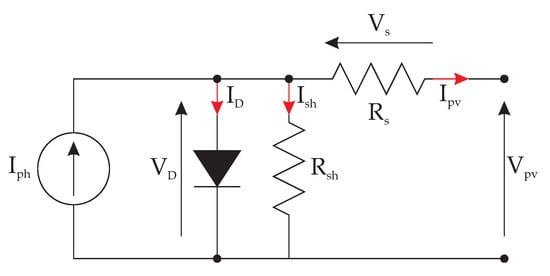 SPVM have a highly non-linear conduct, ranging from the ideal model behavior being described by three parameters to more complex models that use five or even seven parameters. Increasing the number of parameters included in the SPVMs electrical model increases the difficulty of obtaining these parameters; therefore, the electrical model must be carefully selected [,,,]. In many studies, the five parameter model displays sufficient accuracy to describe the operation of the SPVM, as it is capable of predicting the behavior of the module under different operating scenarios with high precision [,], in addition it includes the transition to different operating conditions starting from a particular state. The transition between two operating conditions was subsequently refined by Boyd et al. []. Different methodologies are used to determine the input parameters of the models, and the currently available tools are the explicit methods through Lambert’s W function [], the iterative method, the heuristic method, and the metaheuristic approaches.