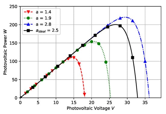 The equivalent thermal voltage is directly correlated to the ideality factor of the diode in the electrical model. The impact of a on the PV power curve is displayed in Figure 3, and the shape of the curve is not significantly altered with respect to the ideal curve. However, as the value of a increases, the power and voltage of the PV curve increase in a near direct proportional manner with respect to a.