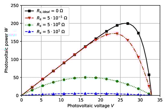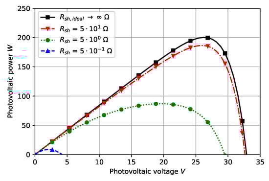 The shunt resistance indicates the leakage of current through the cell around the edges of the device and between contacts of different polarities []. The shunt resistance significantly impacts the PV curve as its value tends to 0 , whereas for high values, the impact on the curve is minimal. This is because small values of tend to short-circuit the current source of the five parameter model and, thus, the power is not able to leave the SPVM. The situation described is presented in Figure 6, where it can be appreciated that values in the order of 1 degrade the maximum power of the PV curves by more than 100 W (with respect to the ideal PV model).